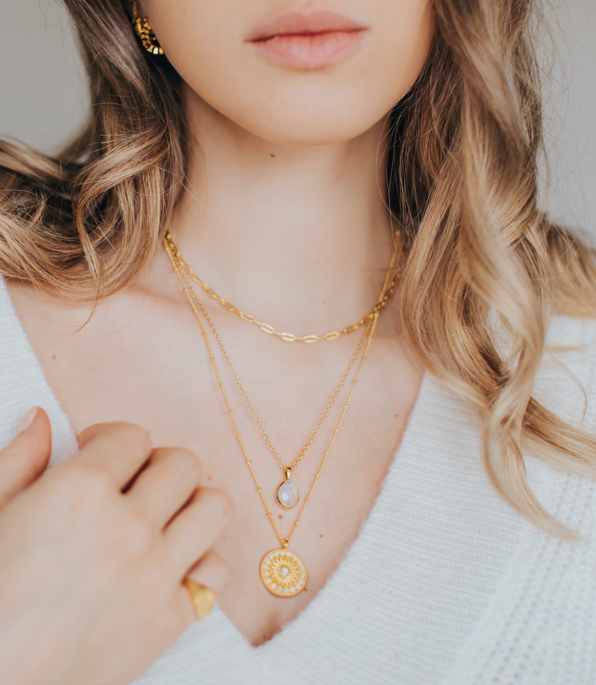 The Aurelia Opal Coin Necklace. Adorned with radiant opals which symbolise hope and truth and gives off rainbow flashes when it hits the light. It truly is a magical stone so we had to use it as the featured gemstone in our largest coin necklace.