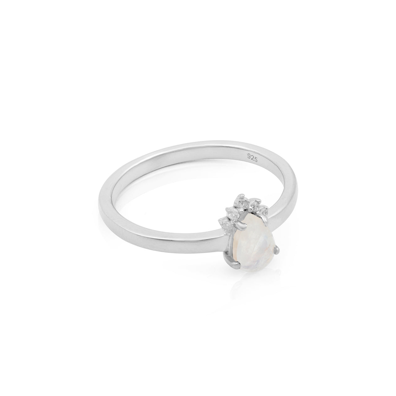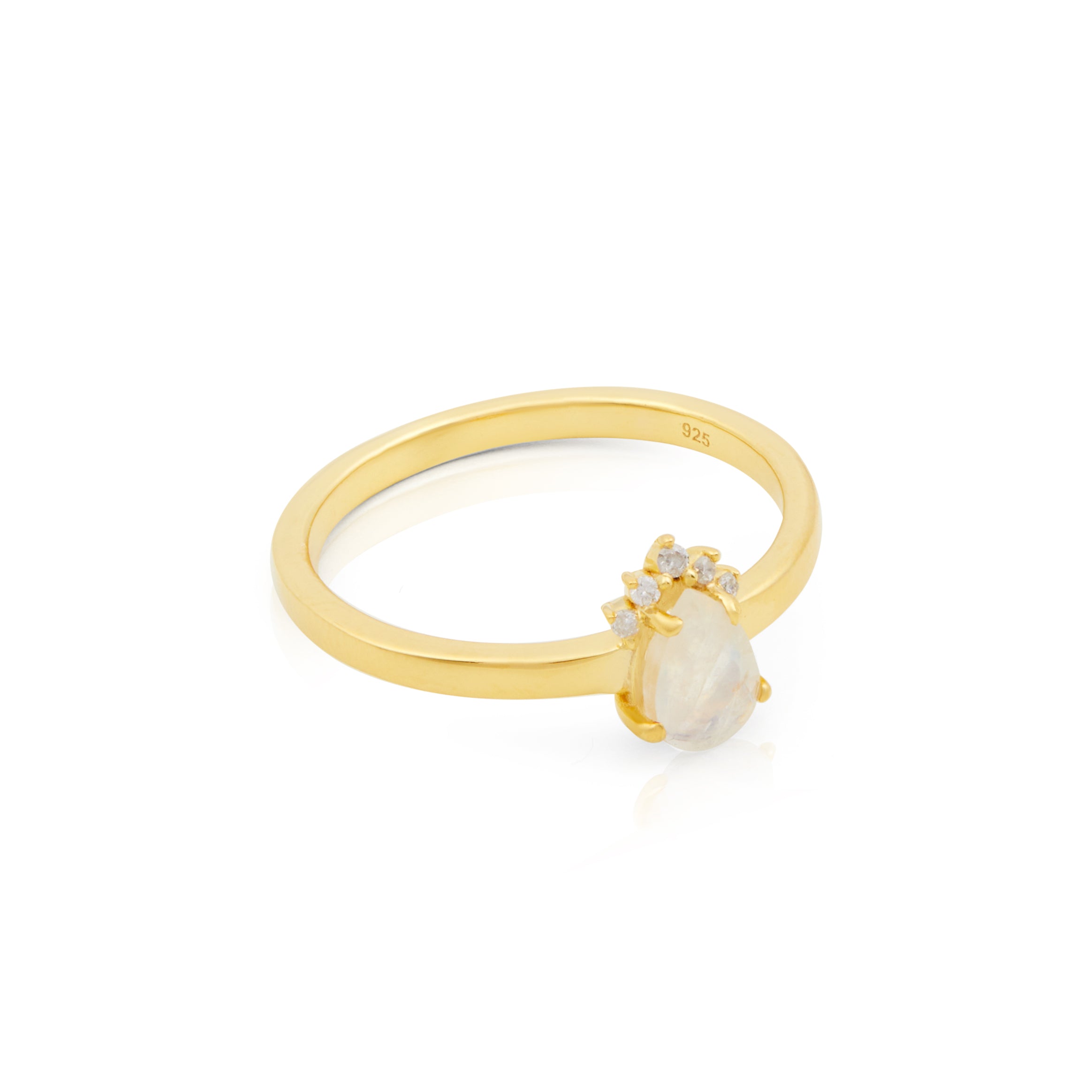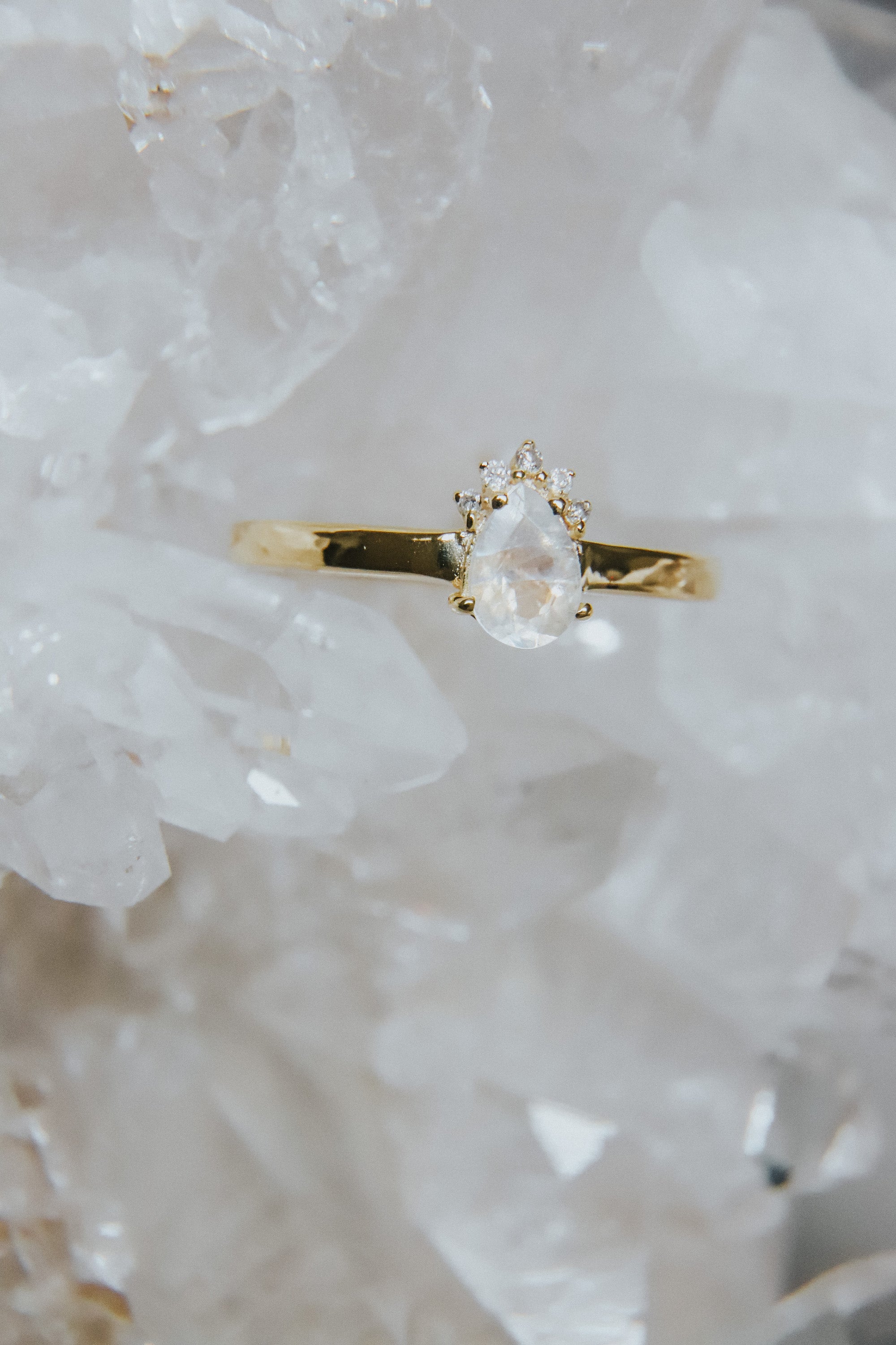 The Selena Ring features a beautiful pear cut rainbow moonstone crowned with 5 diamonds. A stunning and special ring which stacks beautifully with the Clara Marquise Crown Ring.